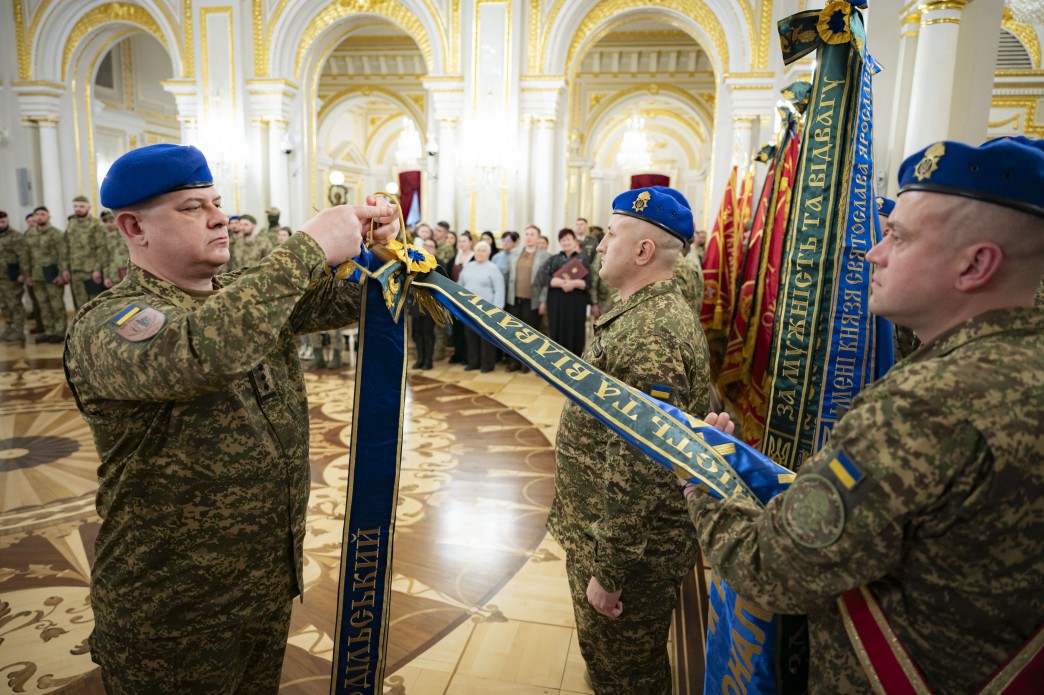 Президент також вручив керівництву підрозділів стрічки почесних найменувань: 127-й окремій важкій механізованій бригаді присвоєно почесне найменування «Харківська», 27-му полку НГУ – «імені князя Святослава Ярославича», 36-му полку Національної гвардії України – «Подільський».