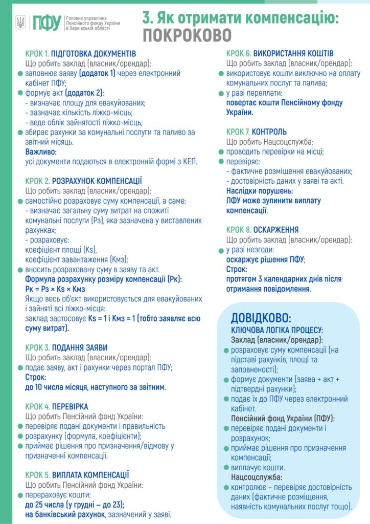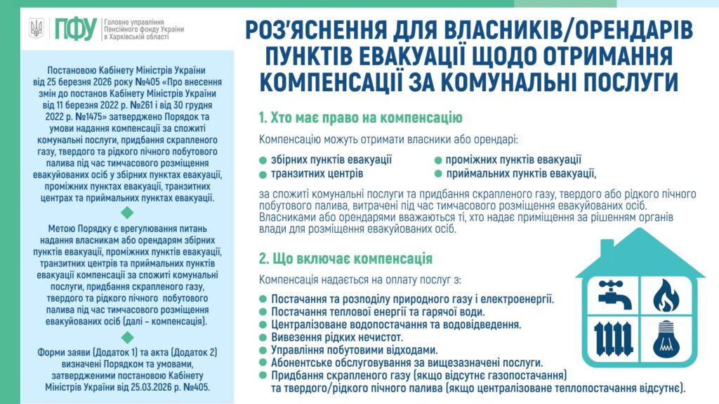Головне управління Пенсійного фонду України в Харківській області повідомляє, що постановою Кабінету Міністрів України від 25 березня 2026 року № 405 «Про внесення змін до постанов Кабінету Міністрів України від 11 березня 2022 року № 261 і від 30 грудня 2022 року № 1475» затверджено Порядок та умови надання компенсації за спожиті комунальні послуги, придбання скрапленого газу, твердого та рідкого пічного побутового палива під час тимчасового розміщення евакуйованих осіб у збірних пунктах евакуації, проміжних пунктах евакуації, транзитних центрах та приймальних пунктах евакуації.